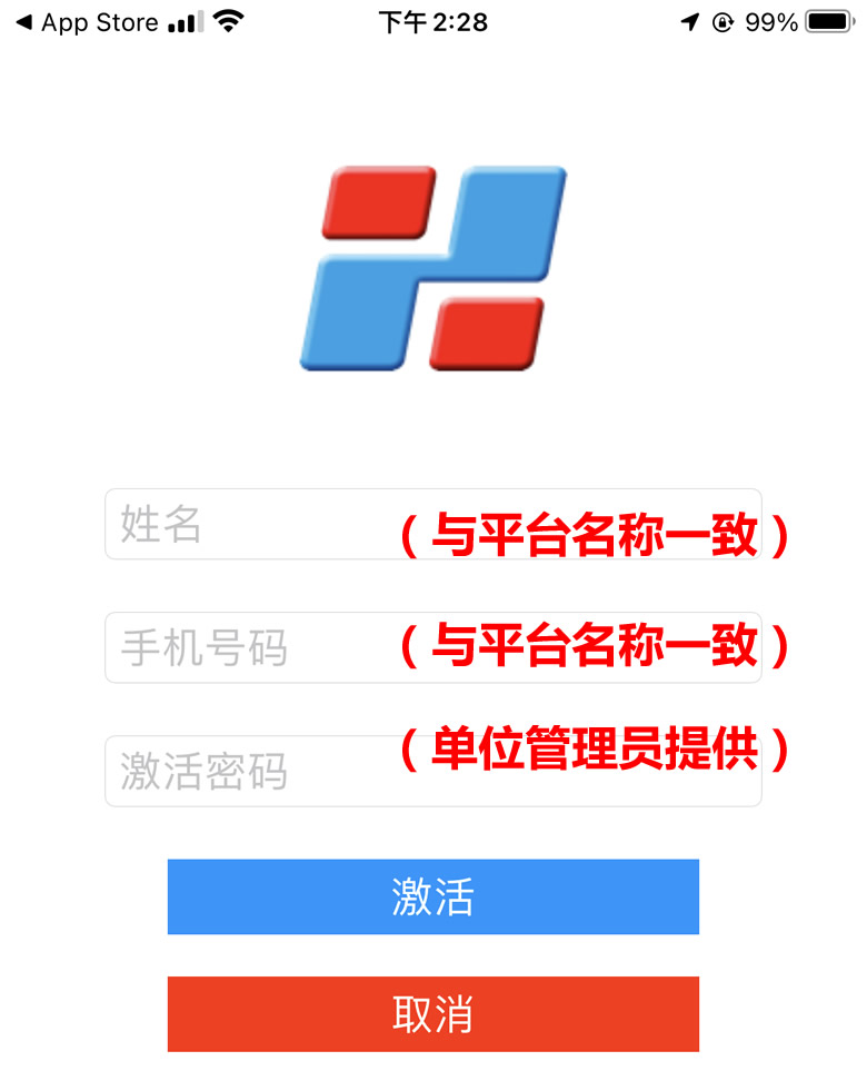 图2 手机安装APP图1.2 激活软件软件激活:启动“澎和外勤通”,首次打开时,会出现激活提示页面,输入姓名、电话号码,输入密码(默认为手机号码后6位、或由单位管理员提供),点击“激活”按钮。