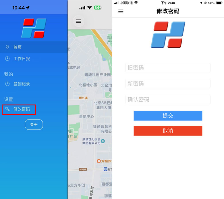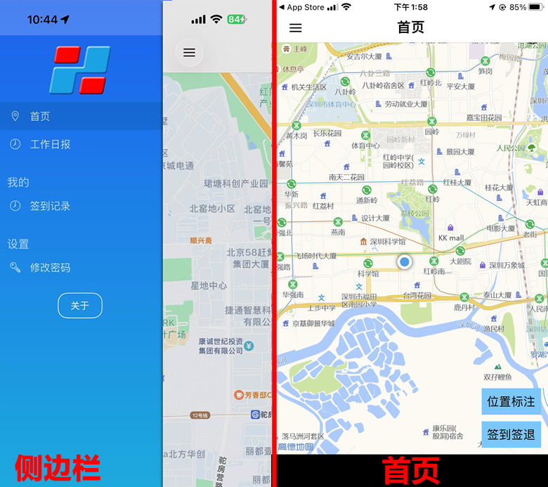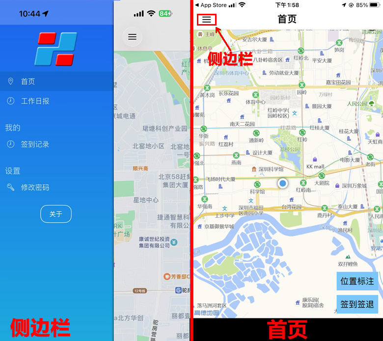 图10 软件界面“澎和外勤通”有首页和侧边页两个界面。启动时直接进入首页,点击首页左上按钮,将出现侧边页面。