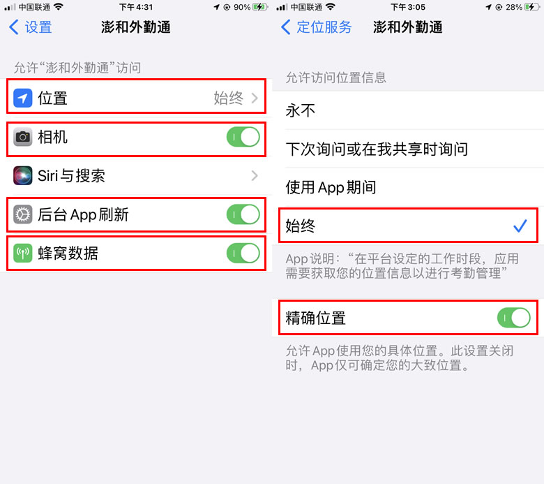 允许“澎和外勤通”在您并未使用该应用时访问您的位置吗?请点击“更改为始终允许”!