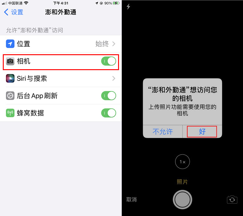 3.“澎和外勤通”APP,“签到签退”、“位置标注”或“工作日报”在使用中,点击“添加照片”出现提示中,选择相机,会出现权限设置框,点击“好”授予使用相机权限。如下图: