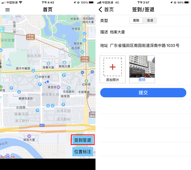点击“工作日报”,输入相关的内容,“添加照片”选项可以调取相机进行拍照(可以不作操作),点击“提交”按钮,提示“提交成功”,自动返回主页面。