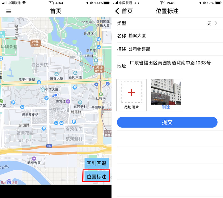 标注成功后,管理员可以在“澎和外勤通”平台查看到位置标注的信息,包括描述的内容以及上传的相片。