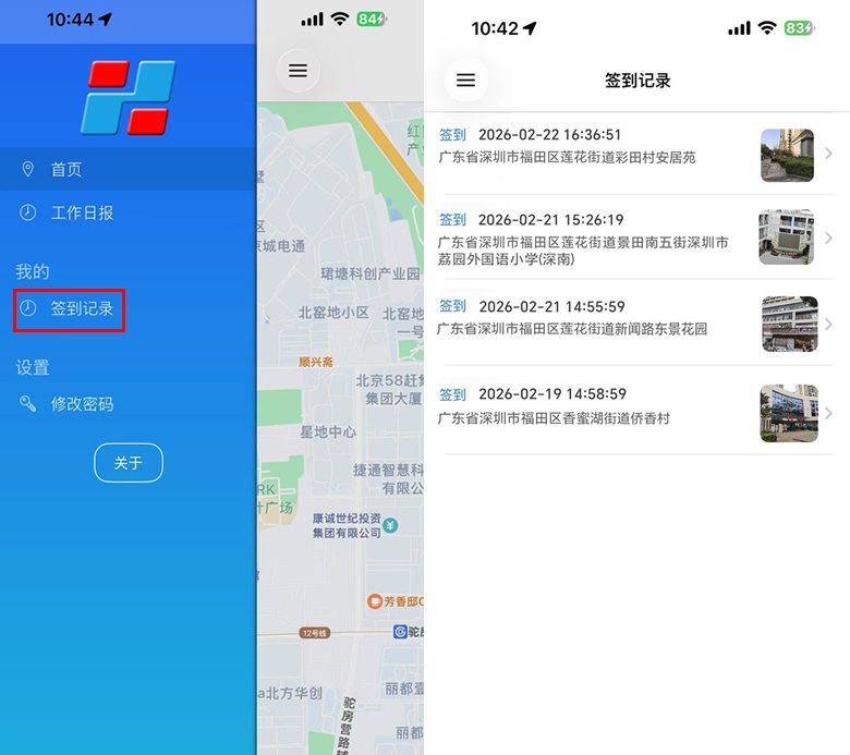 3.6 签到记录点击左上角侧面菜单键,点击“签到记录”可以查看签到记录。