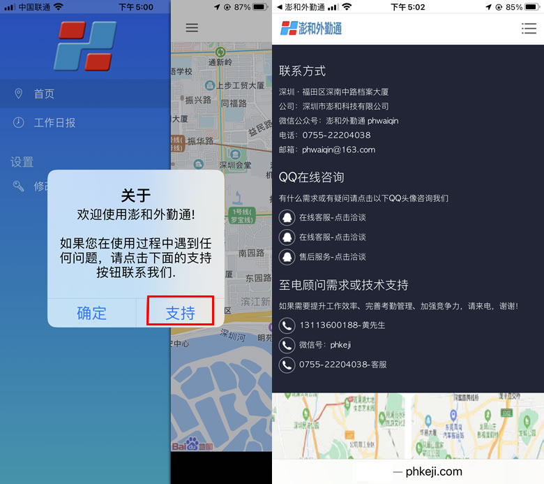 如在使用“澎和外勤通”遇到问题,通过点击侧边页面的“关于”,将通过通过浏览器进入“澎和外勤通”官方网页获取联系方式,进行相关咨询。如下图: